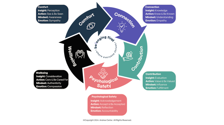 So what are the five indicators of belonging? They are comfort, connection, contribution, psychological safety and well-being, and all of them can be measured.