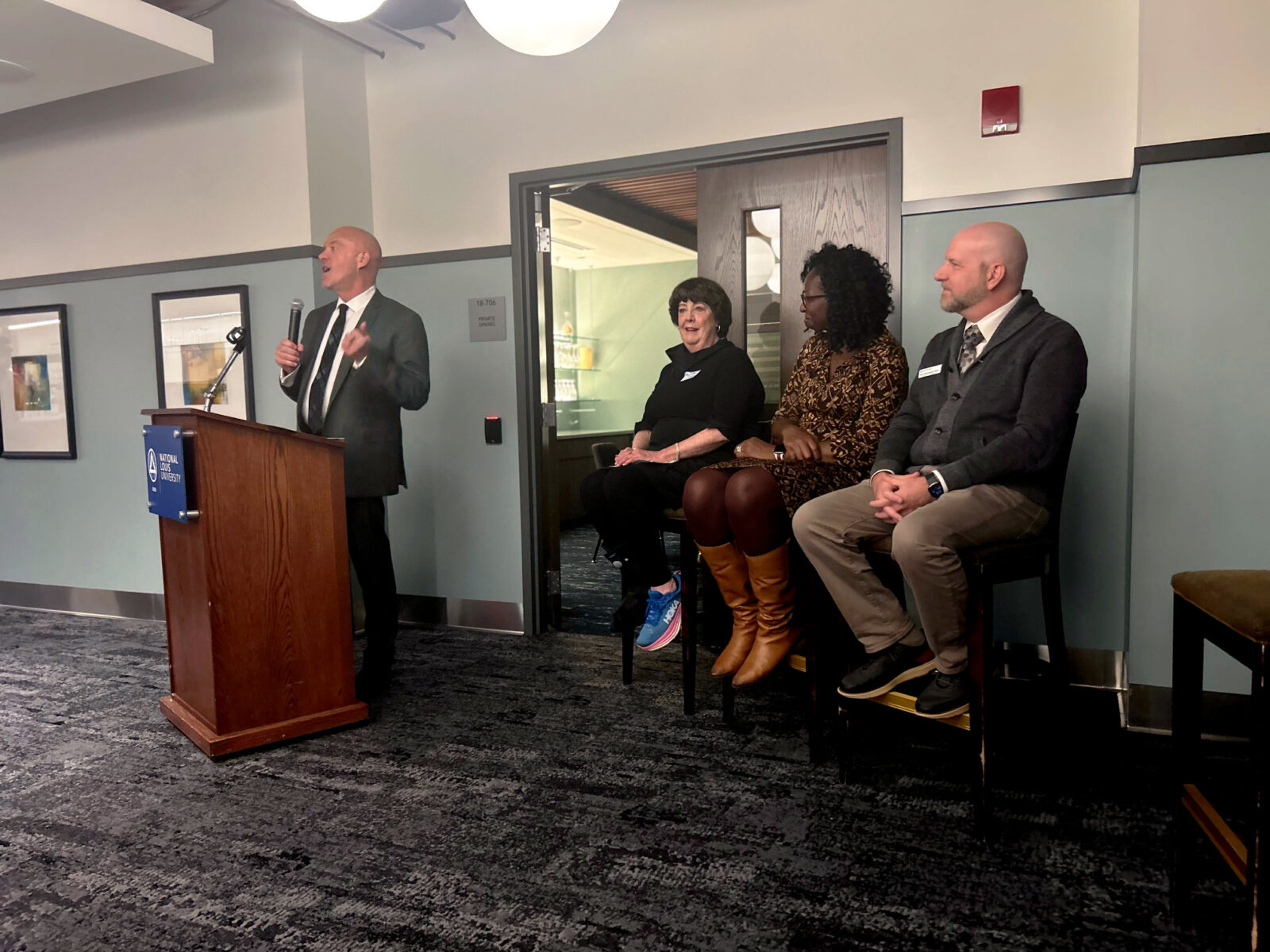 The panel included Mary Ellen Caron, Ph.D., CEO of After School Matters, one of Chicago’s premier nonprofits providing Chicago teens the opportunity to explore their passions and develop their talents through after-school and summer programs; Adler Board of Trustees member Kathleen St. Louis Caliento, Ph.D., president and CEO of the Cara Collective, which engages job seekers, employers, and other organizations to break the cycle of poverty through the employment; and Kevin Osten-Garner, Psy.D., executive director of Adler Community Health Services, the clinical training center of the University.